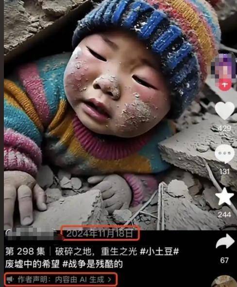 ▲引热议的“地震小孩被埋图”被曝前年就在某平台的一条短视频中出现过,并声明是AI生成