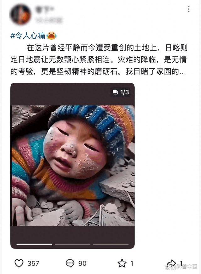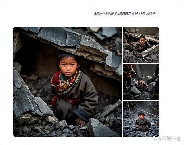 比如底下这个闲居流传在“日喀则地震”视频中的图片——一个戴帽子、被压在废地下的小孩,其实即是由 AI 生成的。