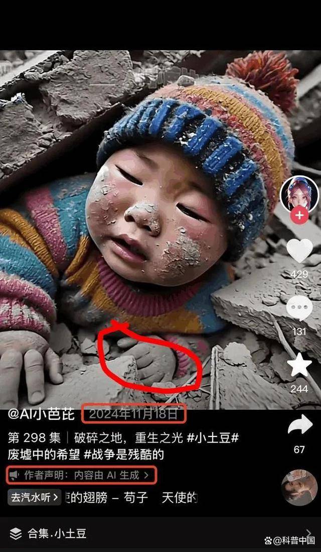 据“全民较真”公众号查证,它最早出刻下一个叫“ AI 小芭芘”的账号 2024 年 11 月 18 日的短视频中,作家也声明了“实质由 AI 生成”。仔细不雅察图片红圈的部分,也不错看到这个小孩的左手有 6 根手指。