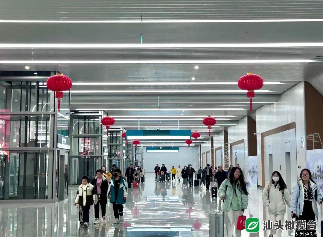 △汕头站到达大厅大红灯笼高高吊挂,营造喜庆节日氛围。