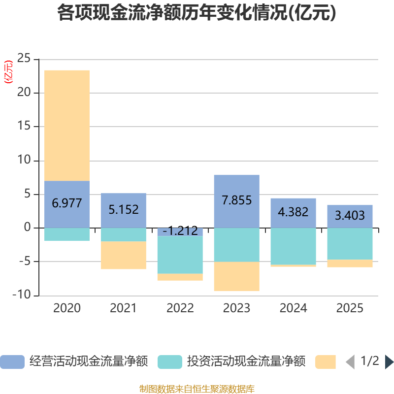 限制2025年,公司操办活动现款流净额为3.4亿元,同比下落22.35%;筹资活动现款流净额-1.12亿元,同比减少8359.47万元;投资活动现款流净额-4.7亿元,上年同时为-5.46亿元。