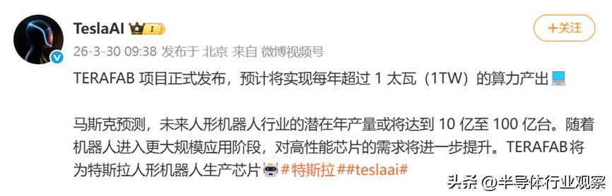 3 月 30 日,特斯拉 AI 官方微博扔下一颗改换民众的重磅炸弹:代号TERAFAB 的超等芯片工场花式,平定全面入手!
