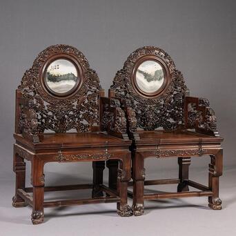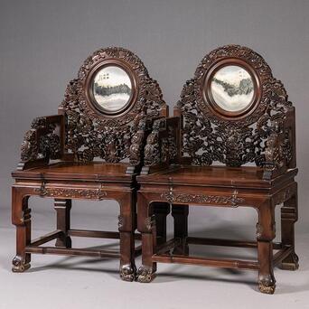 清 红木镶云石透雕灵芝纹太师椅(一双)欧洲杯体育