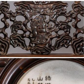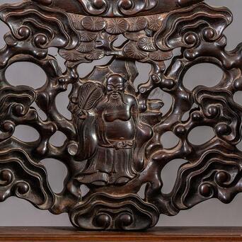 此对太师椅取宫廷御制之威仪,融林泉高致之逸趣,丽都威严,郑重浩然。取上等红木制作而成,木色深郁如古檀,质料硬密,包浆浑润。椅背高耸,屏背中置圆框,作双框想到打算,脉络丰富,如空中阁楼,边框灵芝纹缠绕,交错若祥云腾升,框中嵌入云石,石纹皴擦似米芾泼墨,烟云侍奉间自成云雨高唐之景,缥缈中隐现沉山河,其上提笔“翠山雨坪”“乙未秋月,石公山东说念主”更添古韵悠长。框旁透雕数朵灵芝,寓意吉利如意,福寿无疆,其形制若层云叠涌,三弯九转,云头富有似如意含苞,菌盖环纹如摇荡漾月,菌柄虬曲若苍龙探海,立体若浮出木面,八仙之一汉钟离驻立其间,袒胸露腹,虬髯环颈,一团和气,手握蒲扇,尽显散诞浪漫的真仙仪态。两侧扶手呈门路状,亦整雕圆浑灵芝,浑沌灵光。