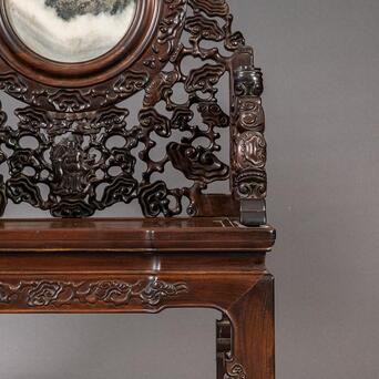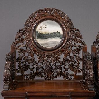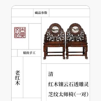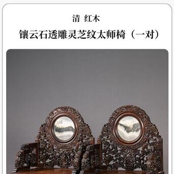 整器形制端方中寓灵动,雕工繁简顺应欧洲杯体育,刚柔并济,双椅对置,但觉云石上的山水随光影流转,灵芝纹在虚实间吐纳祥瑞,坐卧其间,扶手触之生温,靠背倚之挺拔,实乃佳品。